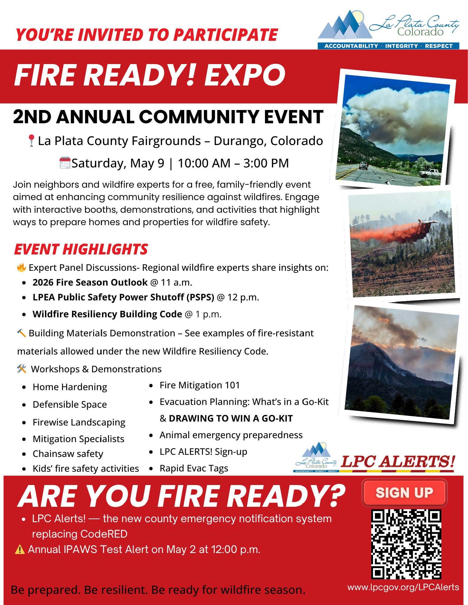 - La Plata County Fire Ready Expo | Saturday, May 9, 2026 | 10:00 AM - 3:00 PM | La Plata County Fairgrounds